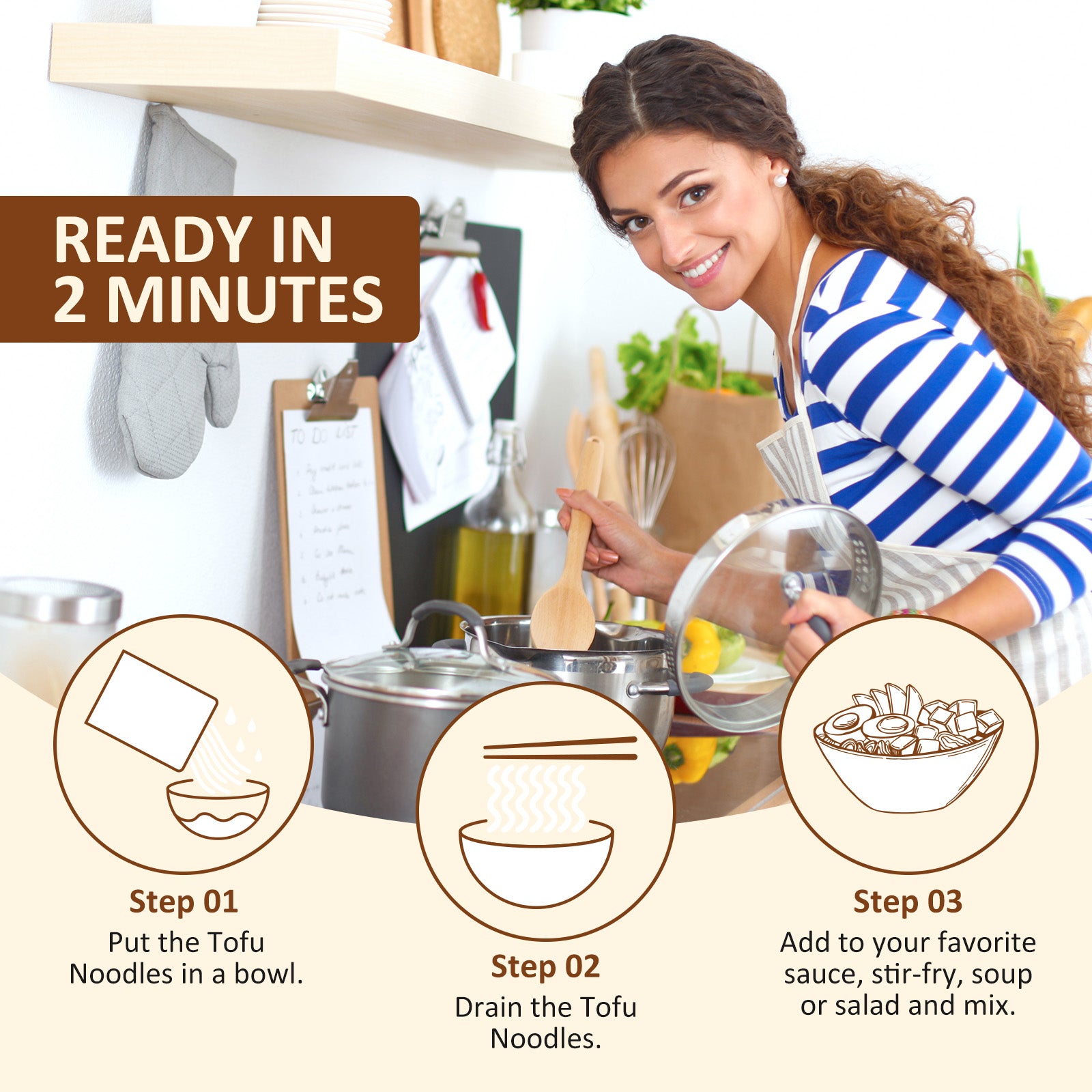 - 4. EASY TO EAT: You can enjoy the healthy flavor in two minutes! Drain the tofu noodles and add your favorite seasonings and side dishes, you can enjoy healthy and delicious food quickly even when you are busy.